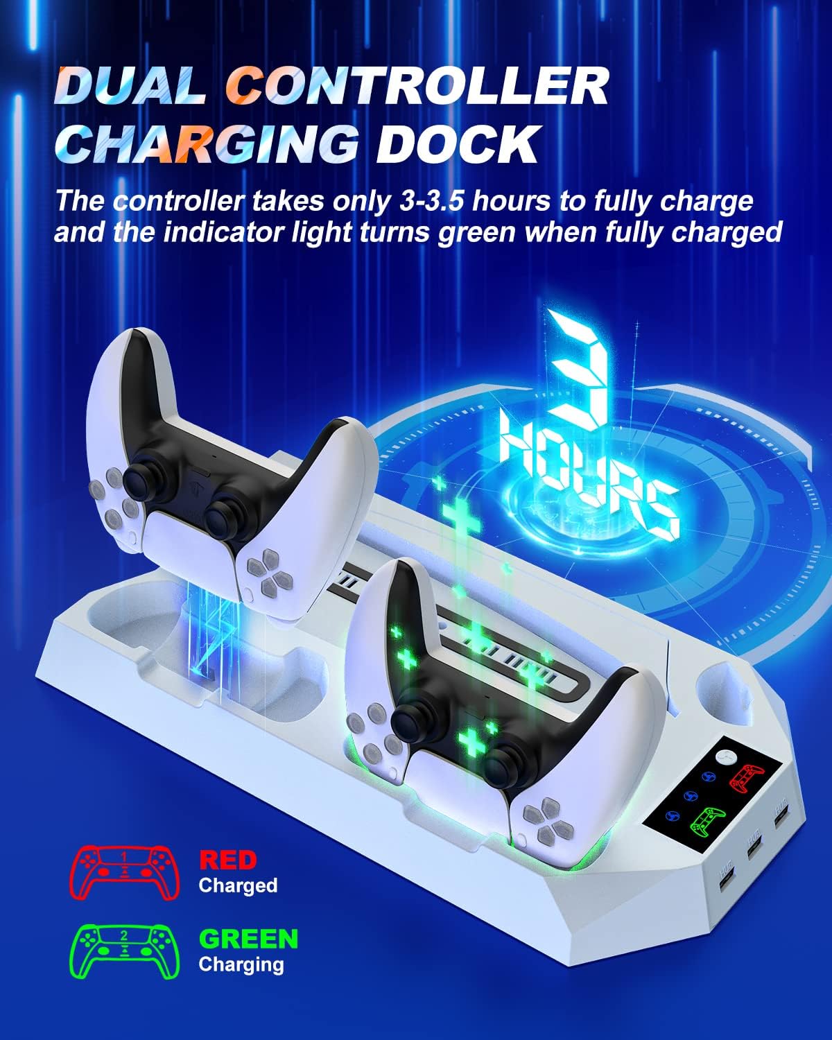 【Further USB Port】The Stand Station has 3 USB ports and might cost varied gaming units similar to headphones, mice, and keyboards. 2 PS5 controllers will also be charged, with a crimson LED throughout charging and a inexperienced LED when totally charged.